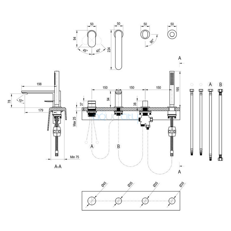 Комплектация держатель для душа / душевой шланг / лейка / смеситель для ванны